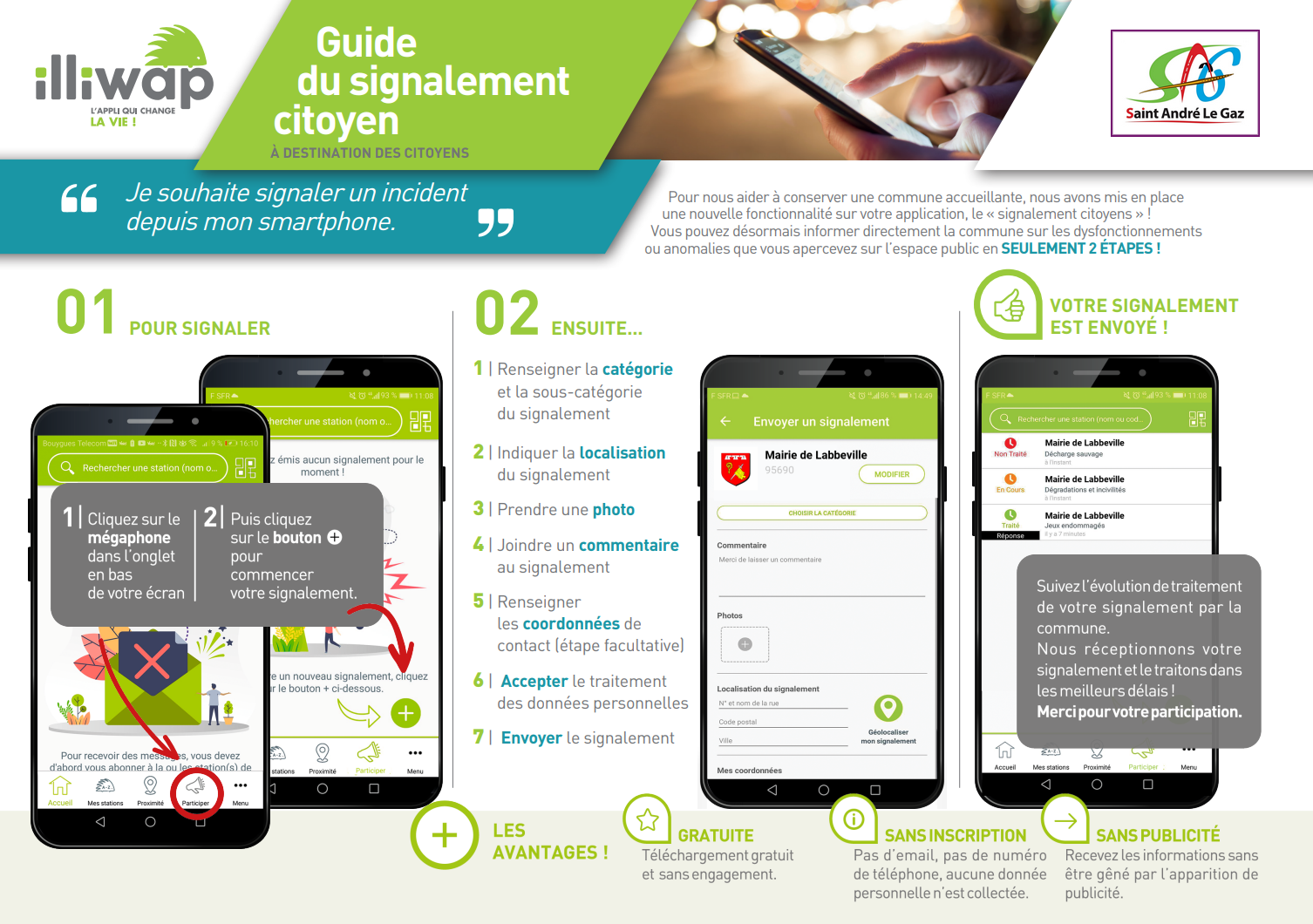 Pour faire un signalement, rendez-vous dans l’onglet « Participez », cliquez sur « Signaler » puis sur « Mairie de Saint-André-le-Gaz ». Cliquez ensuite sur le bouton « + » sélectionnez une thématique, prenez une photo de « l’anomalie », précisez vos coordonnées et éventuellement quelques mots-clés. Le signalement sera géolocalisé instantanément et transmis aux services compétents pour intervenir. L’usager sera ensuite informé de la suite donnée à son signalement.