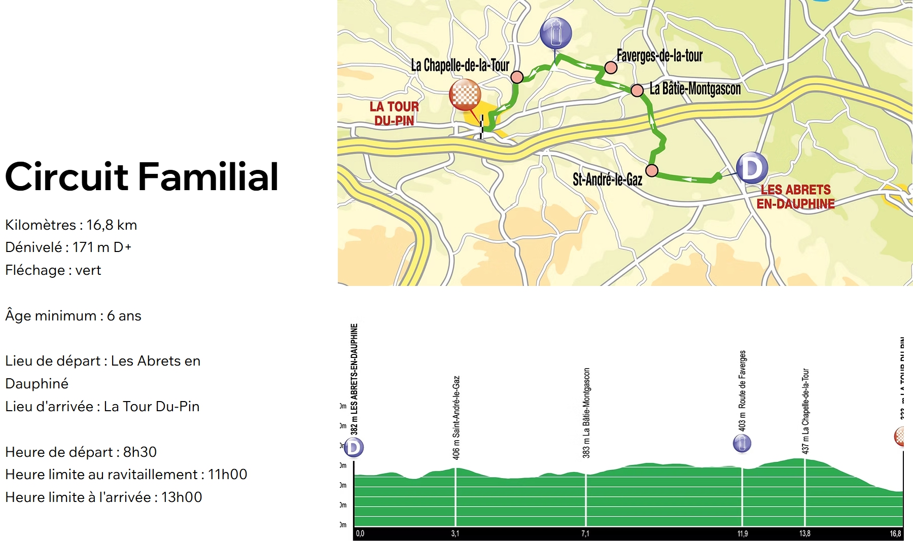 Le circuit Famille passe par Saint-André-le-Gaz (arrivée par La Creuse, rue Michelet, passage place de l’église puis direction Tapon, La Bâtie-Montgascon par les rues Saint-Exupéry et Docteur Schweitzer).