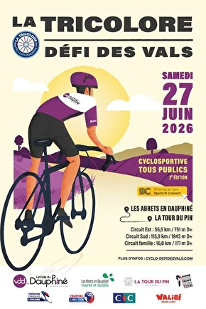 Dans le cadre des Championnats de France de Cyclisme Elite, Les Vals du Dauphiné et le COTNI vous invitent à participer à la 2ème édition de la cyclosportive « La Tricolore, Défi des Vals » Inscrivez-vous à l’un des 3 parcours. Dès 6 ans.