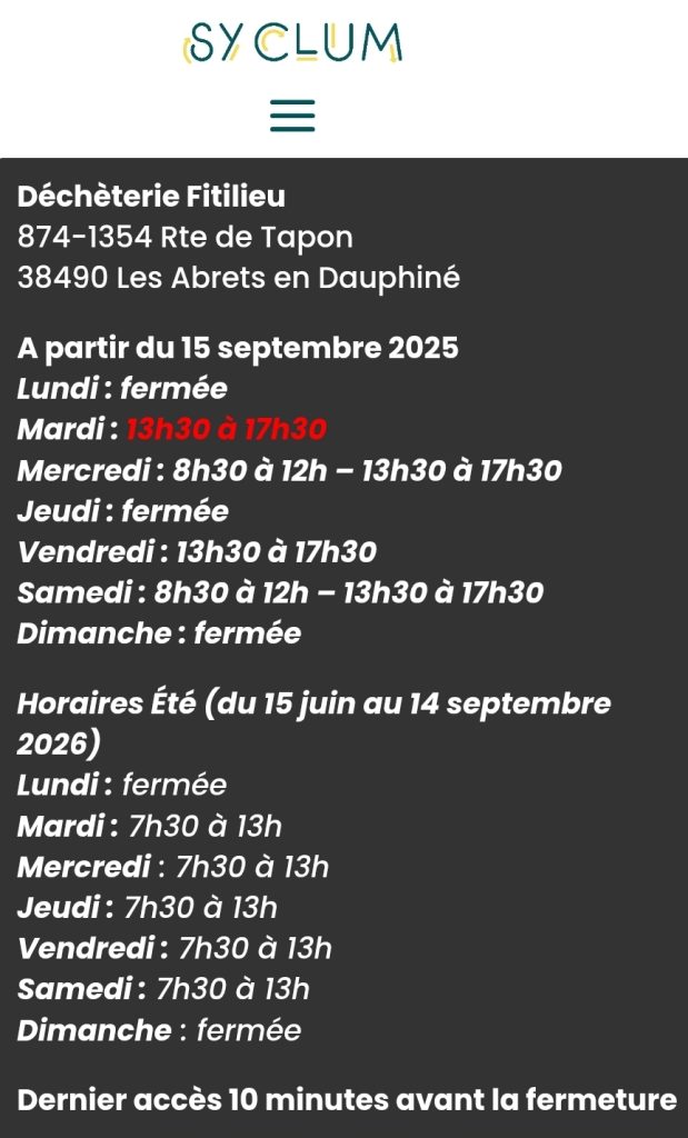 Horaires d’ouverture de la Déchèterie de Fitilieu Tapon