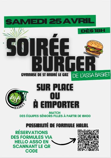 L’Assa Basket vous propose une soirée Burger/Frites le samedi 25 avril au gymnase de St André le gaz dès 18h00. Vous avez la possibilité de manger sur place ou à emporter. Le service débutera à 18h00. Buvette sur place.